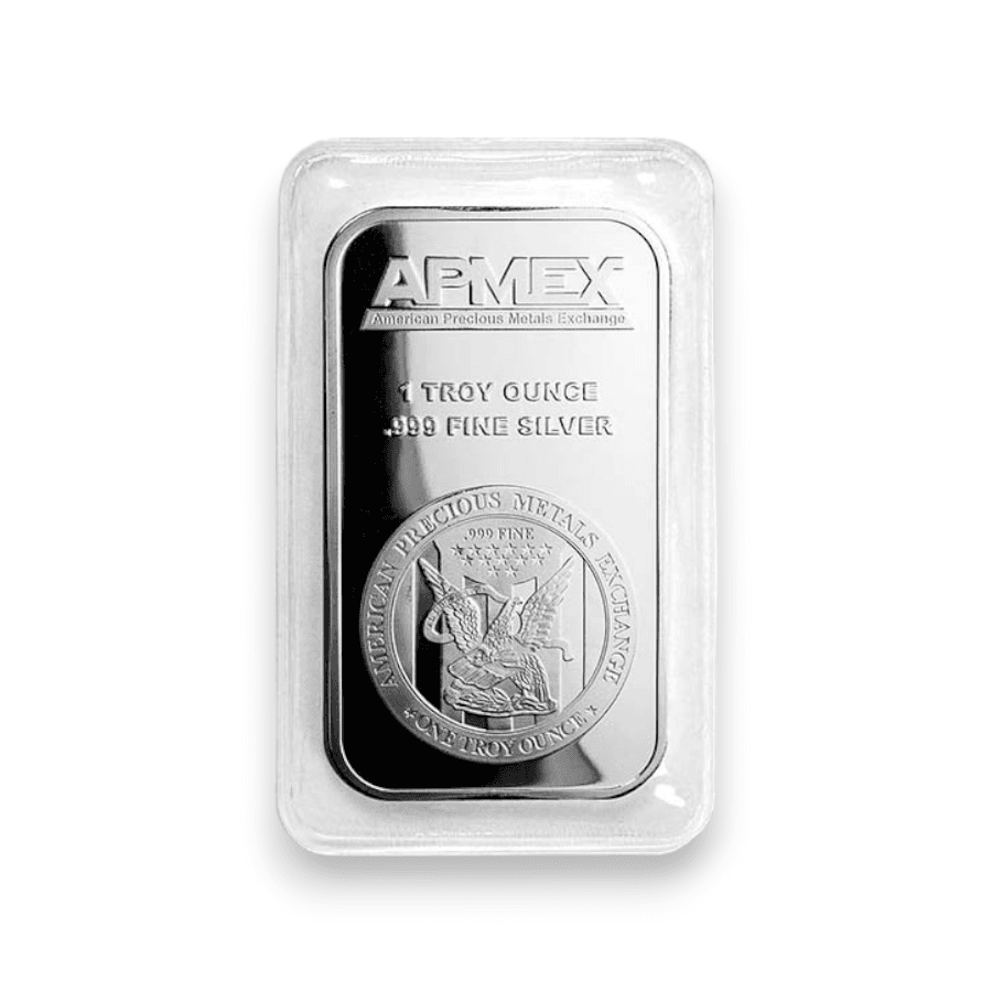 The 1 oz APMEX Silver Bar, with a .999 fine purity, is a popular choice among investors and collectors in the precious metals market. Produced by APMEX (American Precious Metals Exchange), this silver bar contains one ounce of silver with a purity level of 99.9%, making it a high-quality investment product. The design of APMEX silver bars is typically straightforward and functional, often featuring the APMEX logo along with markings that denote the weight and purity of the silver. These bars are valued for their purity, liquidity, and the trust associated with the APMEX brand, known for its wide range of precious metal products and services. The 1 oz size of the bar makes it an accessible and convenient option for diversifying investments with silver, appealing to both novice and experienced investors in the precious metals market.