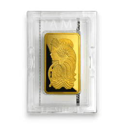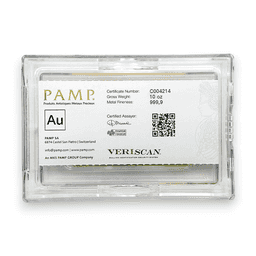The 10 oz Gold PAMP Veriscan Bar, sealed with a plastic assay card and featuring a .9999 fine purity, is an exceptional investment piece from PAMP Suisse, a leading name in the global precious metals industry. This bar contains 10 ounces of 99.99% pure gold, showcasing PAMP Suisse's dedication to producing gold of the highest quality. The incorporation of Veriscan technology sets this bar apart, offering a patented security feature that uses the unique surface topography of each bar as a digital fingerprint, enhancing its authenticity and significantly reducing the risk of counterfeits. The plastic assay card provides vital details such as the bar's weight, purity, and a unique serial number, ensuring the investor's confidence in the bar's security and authenticity. The 10 oz Gold PAMP Veriscan Bar is highly prized by serious investors and collectors for its substantial gold content, exceptional purity, advanced security features, and the prestige of the PAMP Suisse brand, making it a distinguished choice for diversifying investment portfolios with precious metals.