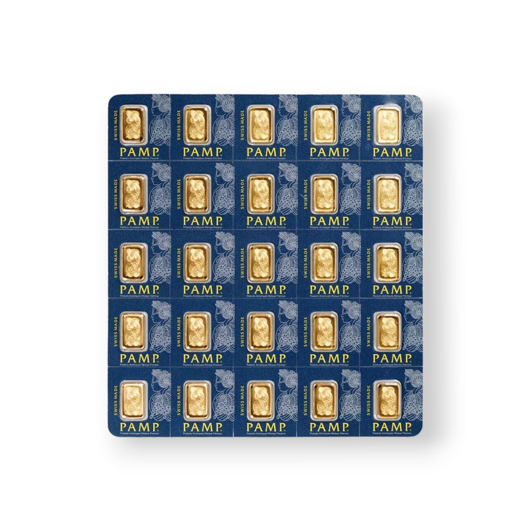 The 25 x 1g Gold Bar PAMP Multigram set is a unique offering from PAMP Suisse, one of the world's leading precious metals refineries. Each set contains 25 individual 1-gram gold bars, meticulously crafted in .9999 fine gold, presented in a securely carded and sealed format. The front of each bar showcases PAMP's iconic Lady Fortuna design, a symbol of wealth and prosperity, while the reverse confirms the bar's weight, purity, and unique serial number. The Multigram set provides investors and collectors flexibility, allowing the owner to use individual bars separately if needed. This innovative packaging approach ensures each bar remains protected and in mint condition. Whether you're diversifying your investment or gifting a precious keepsake, the PAMP Multigram Gold Bar set embodies quality, trust, and the artistry for which PAMP Suisse is renowned.